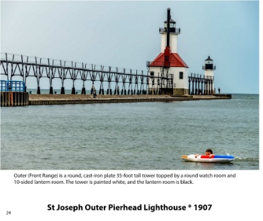 Outer (Front Range) is a round, cast-iron plate 35-foot tall tower topped by a round watch room and 10-sided lantern room. The tower is painted white, and the lantern room is black. St Joseph Outer Pierhead Lighthouse * 1907 24