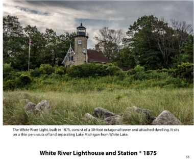 The White River Light, built in 1875, consist of a 38-foot octagonal tower and attached dwelling. It sits on a thin peninsula of land separating Lake Michigan from White Lake. White River Lighthouse and Station * 1875 33