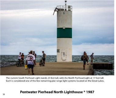 The current South Pierhead Light stands 25 feet tall, with the North Pierhead Light at 17 feet tall. Each is considered one of the few remaining pier range light systems located on the Great Lakes. Pentwater Pierhead North Lighthouse * 1987 38