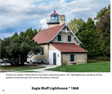 Perched on a bluf, 76 feet above Green Bay’s glistening waters. The 1868 lighthouse, standing 43 feet, guided vessels through the narrow Strawberry Channel. Eagle Bluf Lighthouse * 1868 82